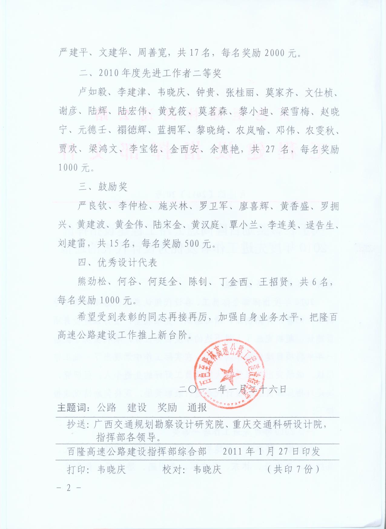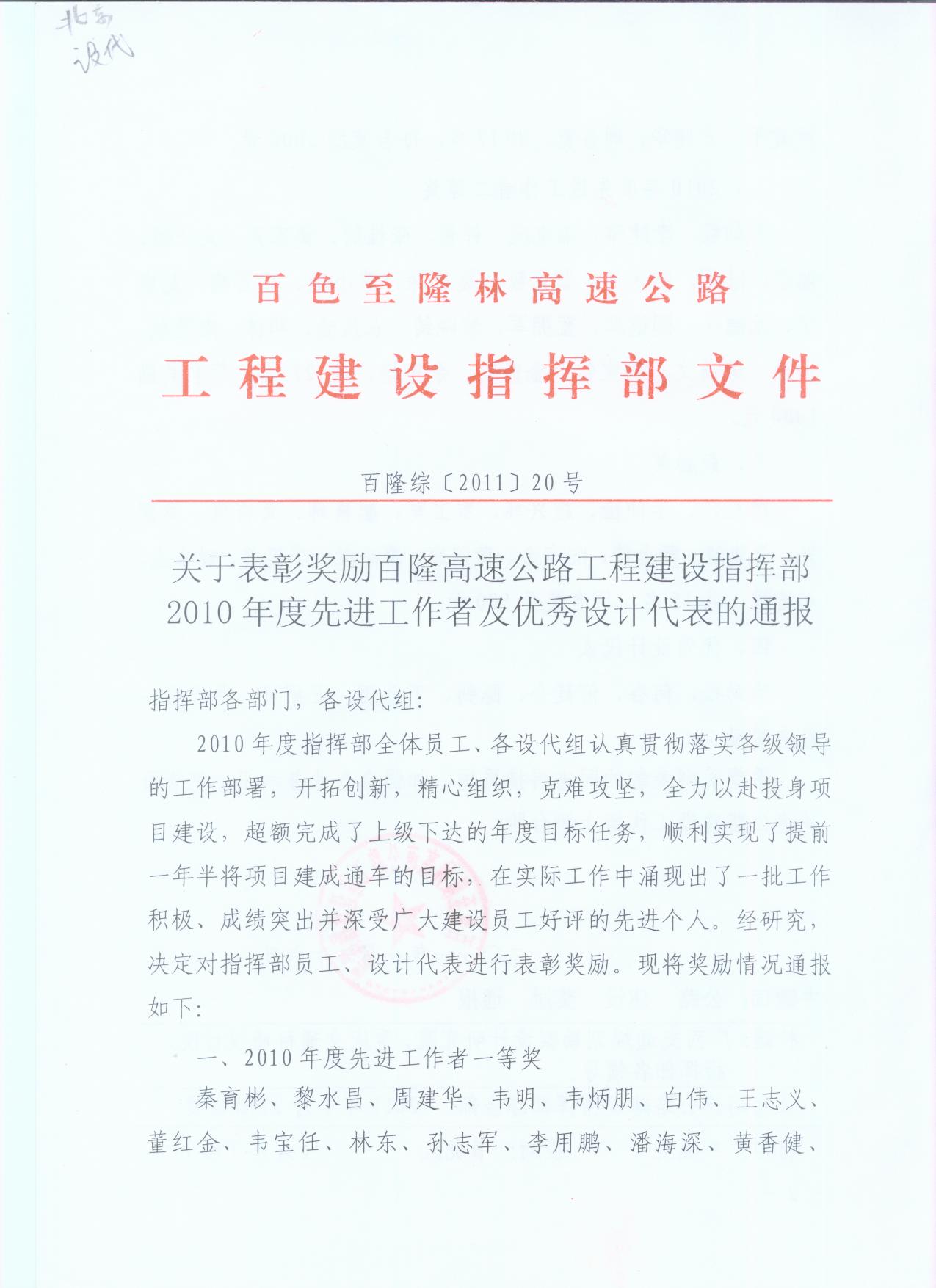 2011年1月27日,广西百色至隆林高速公路顺利举行了通车仪式,在该项目的设计服务工作中,我院获得业主一致好评,驻地设计代表王招贤获得业主授予“优秀设计代表”称号,并发文通报表扬。