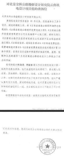 12月22日,云南省公路开发投资有限责任公司向我院发来表扬信,对机电设计项目组特别是何培舟、李柏恒两位同志提出了表扬,肯定了我院的工作精神和设计质量,对我院各级领导和设计人员在云南省机电系统建设中所做的贡献表示感谢。