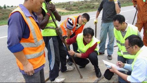 为了深入了解造成路面损坏的主要原因和后期处理方案,孟书涛等专家组人员深入现场对路面病害原因进行了调查,通过现场取样,室内和现场试验,取得了第一手资料,并在此基础上,经理论分析,在最短的时间内为中国建筑股份公司刚果项目部提交了详尽的补强设计、处治方案和技术咨询报告,为刚果参建各方提供了强有力的技术支撑。
