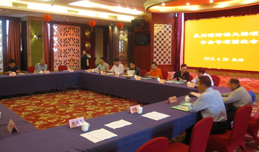 2015年4月29日,泉州湾跨海大桥有限责任公司在泉州市组织召开了泉州湾跨海大桥项目安全验收评价专家审查会,泉州交委书记林晋炼,泉州交委副主任黄俊杰,我院苗家武副院长以及专家和相关单位参加了会议。在审阅评价报告,听取我院的汇报和现场查看后,在充分讨论的基础上,专家和领导认为我院的评价工作依据合理、内容全面,评价方法科学,结论明确、建议措施恰当,为即将通车运营的大桥提供了安全保障。