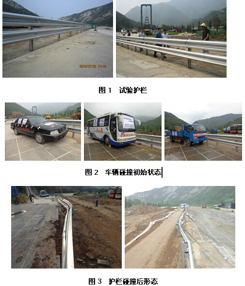 根据交通运输部最新颁布的行业标准《公路护栏安全性能评价标准》(JTG B05-01—2013)的要求,对小型客车(车辆总重1.5t、碰撞速度100km/h、碰撞角度200 )、中型客车(车辆总重10t、碰撞速度60km/h、碰撞角度200 )、中型货车(车辆总重10t、碰撞速度60km/h、碰撞角度200 )分别进行了实车足尺碰撞试验。