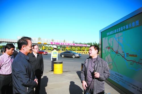 图为国庆长假小客车免费通行首日,杨传堂部长(前左一)在京哈高速公路北京白鹿收费站仔细了解通行情况。本报记者 刘兴增 摄