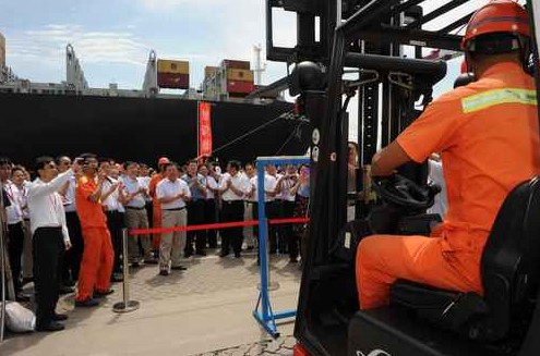 图为现场会上,代表们观摩青岛港港口职工绝活表演。本报记者 杨烨 摄