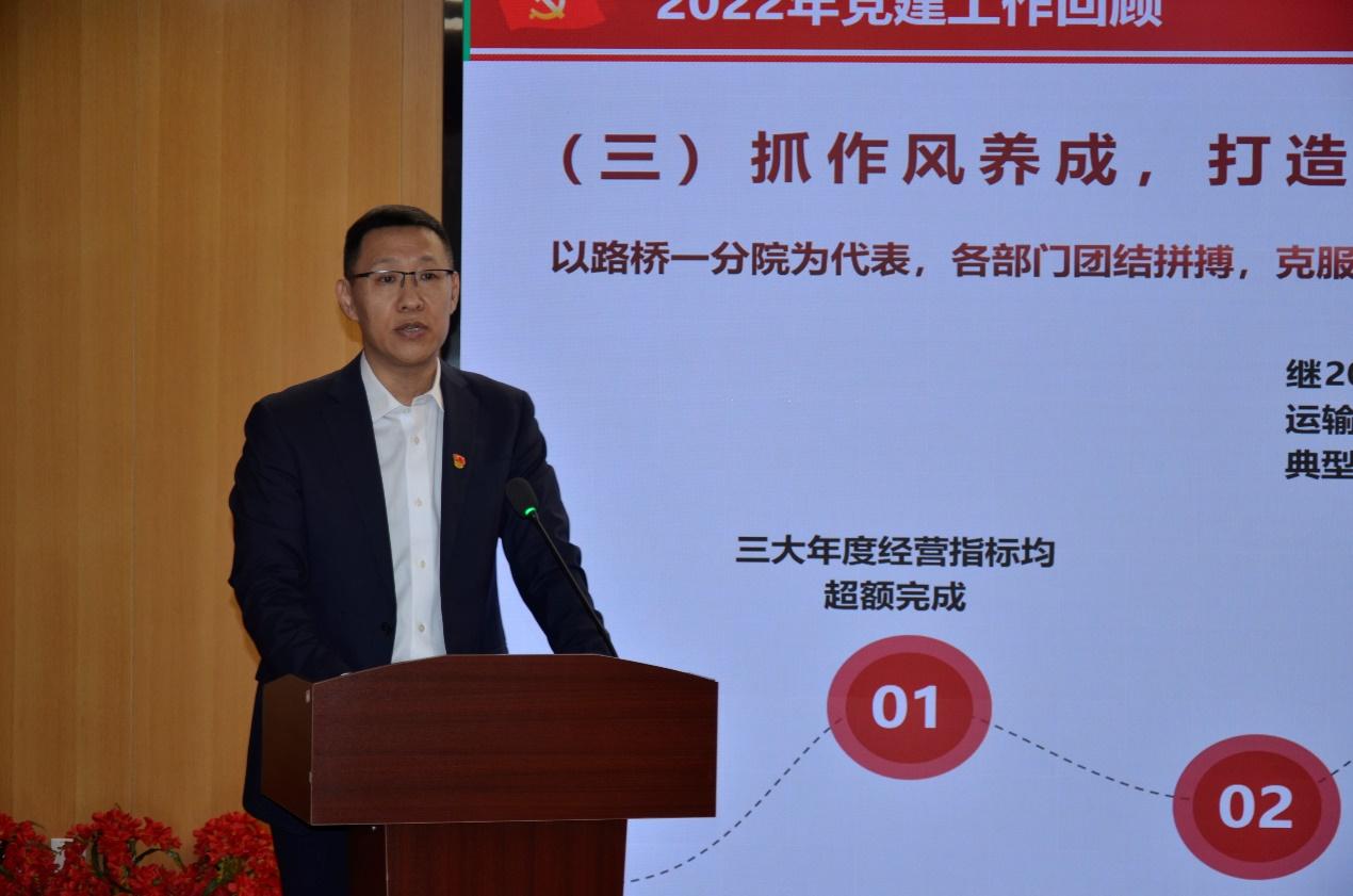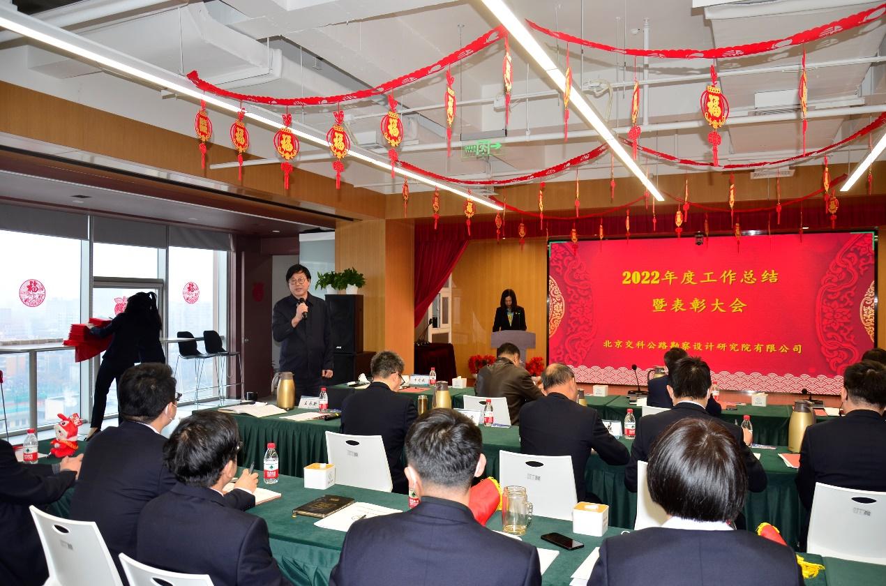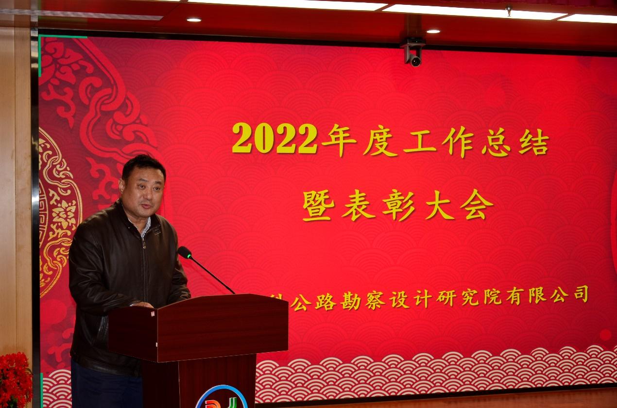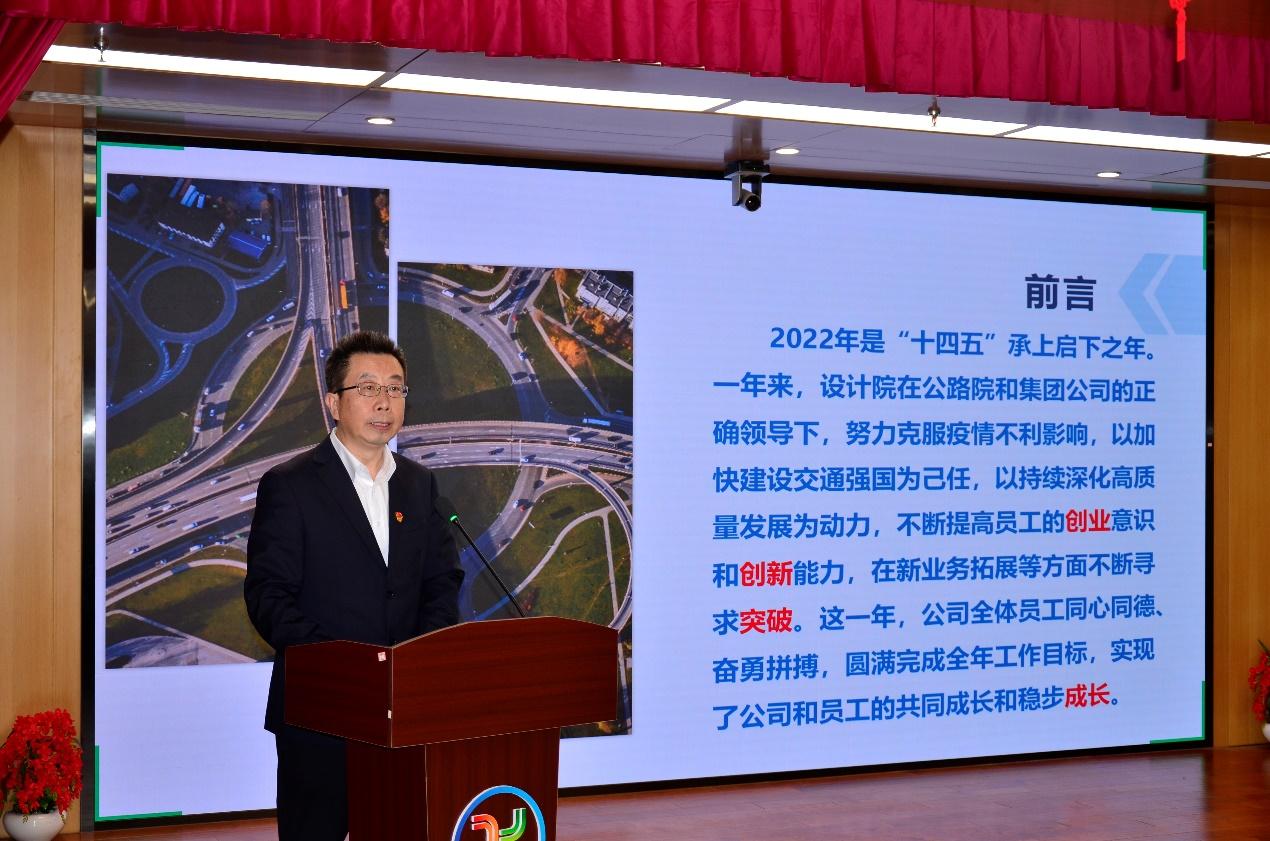 设计院总经理刘会学代表设计院领导班子作题为《创业 创新 突破 成长——构建系统化思维 实现高质量发展》的经营管理工作总结,系统回顾设计院2022年工作情况,总结取得的经验,分析存在的问题,并提出2023年工作思路和重点任务,号召大家在新的一年里团结一致,以赤诚之心、昂扬之姿、奋进之势,继续开拓新的事业,谱写交科更加精彩的篇章!