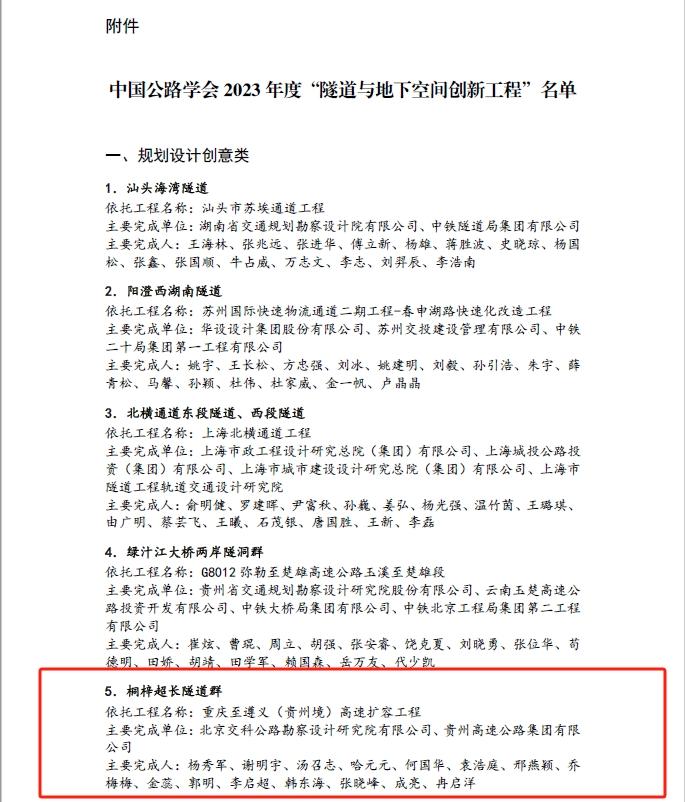 近日,中国公路学会公布了2023年度“隧道与地下空间创新工程”名单,由设计院主持设计的桐梓超长隧道群-交通工程智慧化项目荣获“规划设计创意类”奖项。