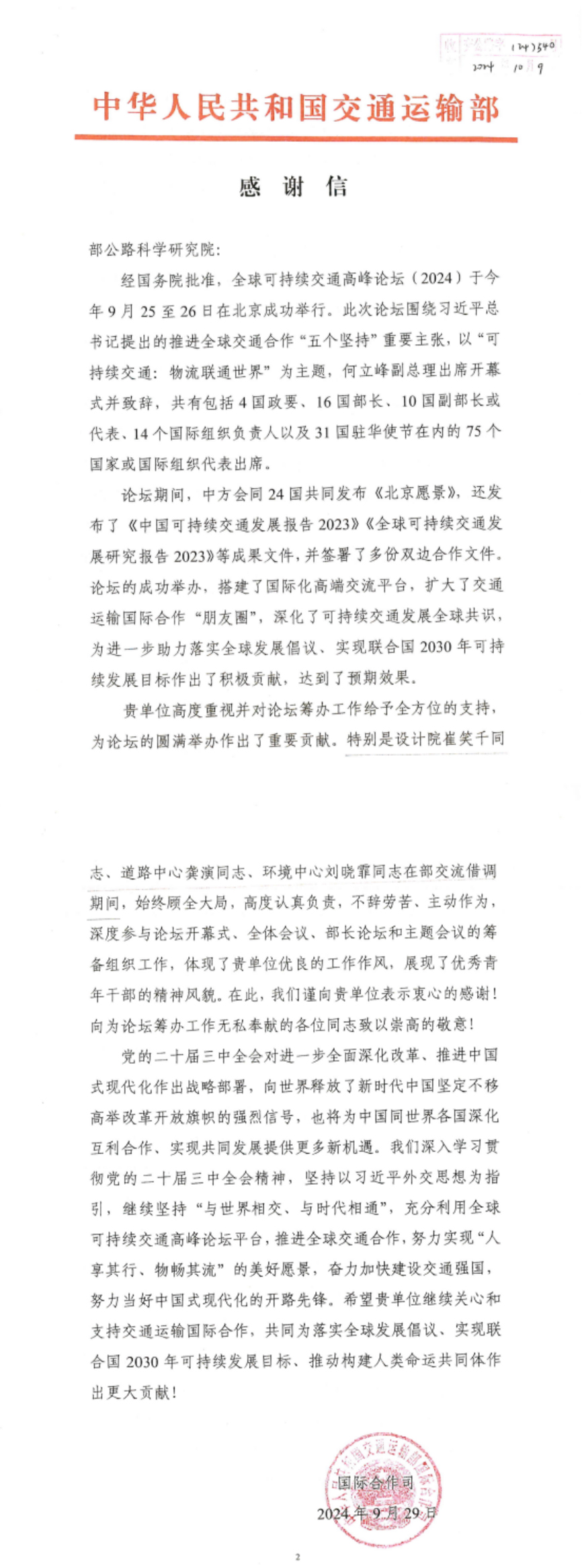近日,设计院荣幸地收到了来自交通运输部国际合作司的感谢信。信中,国际合作司对公司崔笑千同志在“全球可持续交通高峰论坛 (2024)”筹办期间所做出的重要贡献给予了高度评价与诚挚感谢。