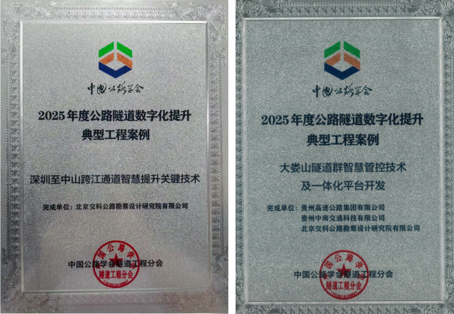会议发布了“2025年度公路隧道数字化提升典型工程案例”并为入选工程颁发了证书,由设计院负责设计的深中通道及大娄山隧道群数字化提升关键技术成功入选。