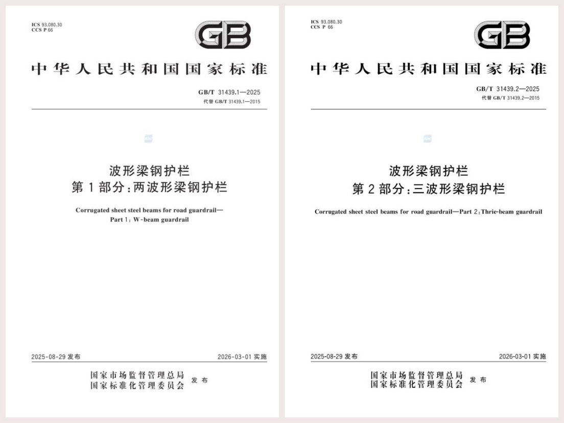 近日,设计院主要参编的《波形梁钢护栏 第1部分:两波形梁钢护栏》(GB/T 31439.1—2025)和《波形梁钢护栏 第2部分:两波形梁钢护栏》(GB/T 31439.2—2025)获批发布,将于2026年3月1日实施。